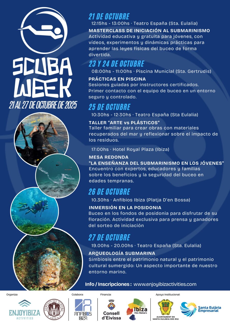 La isla se prepara para inaugurar la nueva edición de SCUBAWEEK Ibiza, una semana dedicada al buceo, la ciencia y la sostenibilidad marina. La apertura tendrá lugar el 21 de octubre con una masterclass orientada especialmente a jóvenes, organizada por Fomento de Turismo de la isla de Ibiza a través de Enjoy Ibiza Activities, en colaboración con el centro ANFIBIOS, y con el apoyo del Consell Insular de Ibiza y el Ayuntamiento de Santa Eulària des Riu.