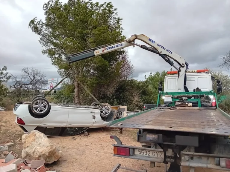 Un grave accidente conmocionó la carretera E-20 cerca de Blancadona, Ibiza, cuando un vehículo volcó a la altura de la nave de Azkar, dejando el automóvil con las cuatro ruedas hacia arriba.
