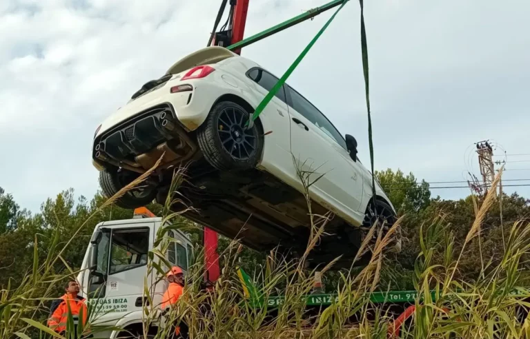 Aparatosa salida de vía en la noche de este pasado miércoles en el torrente junto a las pistas del aeropuerto de Ibiza, en la carretera que conduce a los apartamentos Don Pepe. En este punto, un utilitario de alquiler de altas prestaciones ha caído por un desnivel de unos dos metros, por causas que se desconocen.