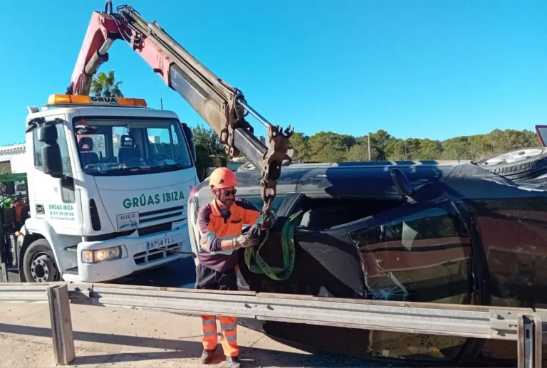 Efectivos de Grúas Ibiza han retirado con grúas pluma ambos vehículos mientras la Guardia Civil regulaba el tráfico.