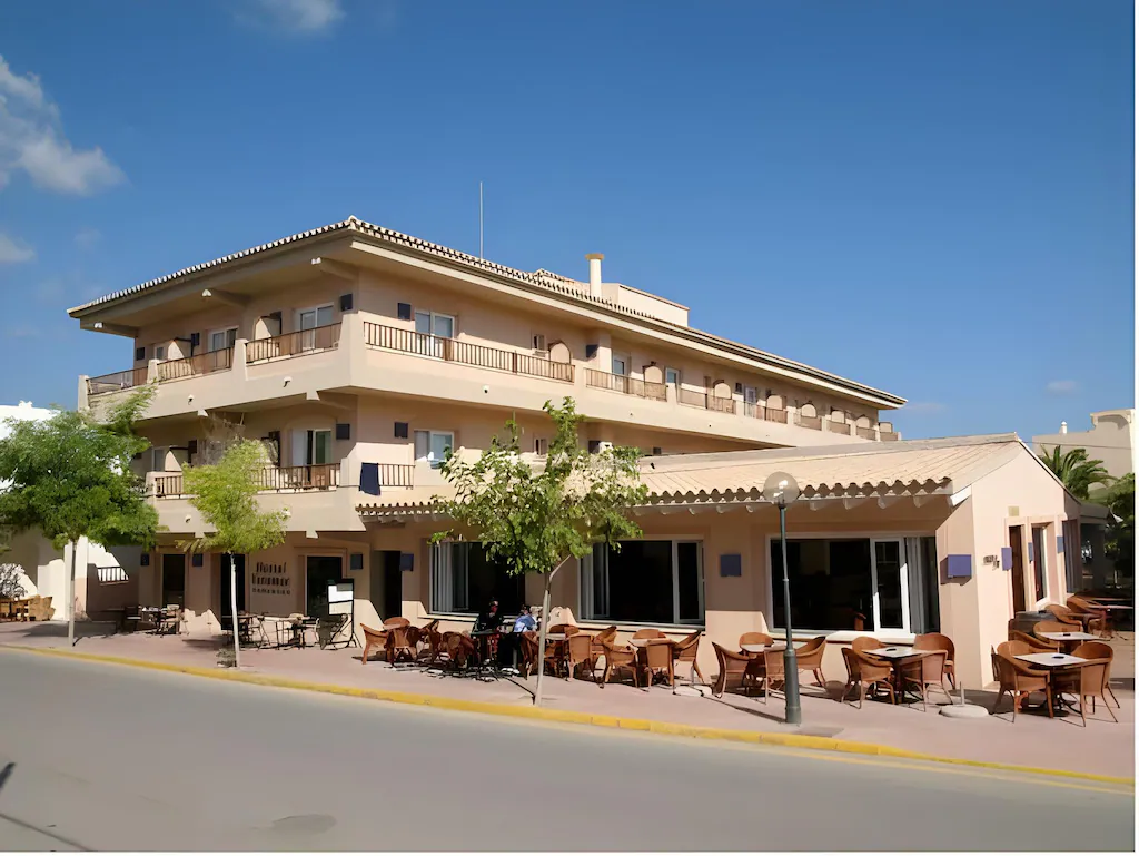 Vista exterior del Hotel Voramar en Formentera con terraza y árboles