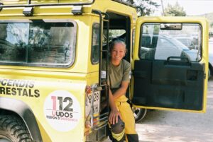 En el año 2002, una amiga que trabaja – creía yo – en medio ambiente en el Consell me dijo que fuera, que había plazas, Yo fui, creída que podría entrar a trabajar en un parque natural, con pájaros por ejemplo y cuando llego, me sientan y me empiezan a formar. De pronto me doy cuenta que empezamos a manipular mangueras y yo pensando “esto es para bombero… bueno, voy a probar”. Me encantó. El ambiente, los compañeros, la adrenalina… me pareció muy interesante. Luego probé y el horario era de 7 a 14 y me encantó porque además me daba la tarde libre para pintar. Pagaba mis facturas con mi trabajo y cero presión para mi lado artístico.
