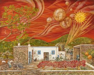 -Esta exposición es ilustrativa a pesar de que normalmente no hago ilustración. En este caso, como me parece aburrido ver directamente lo que he hecho es ir enlazando una cosa con la otra como en un sueño, y el orden no es el orden real. Me gusta que la gente que mira mis cuadros tenga que encontrar las cosas. Esto es simbolismo, hay muchos símbolos dentro. He trabajado con los elementos de forma no obvia, un pez de ese tamaño al mismo tamaño que una montaña, y es porque mi novio de entonces era pescador y comíamos mucho mero. Referencias a todas las cosas que me han pasado desde las casas que he habitado. Hay mundos dentro de mundos, fantasía hay mucha también.