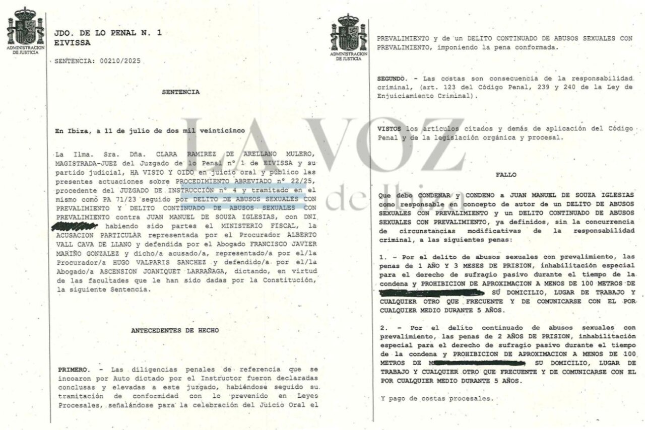 El Juzgado de lo Penal Nº 1 de Ibiza condenó al sacerdote Juan Manuel de Souza Iglesias a una pena de 3 años y 3 meses de prisión por dos delitos de abusos sexuales con prevalimiento, cometidos contra dos menores de edad cuando era párroco de la Iglesia de San Pablo, ubicada en la ciudad de Ibiza. Sin embargo, evitará la cárcel: la pena queda suspendida por un plazo de 2 años, siempre que el condenado no cometa nuevos delitos en ese lapso.