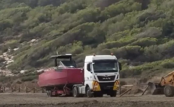 La embarcación permanecía encallada junto a la Torre des Carregador mientras los agentes completaban las diligencias periciales. Su extracción requirió el despliegue de maquinaria especializada debido al difícil acceso y al peso de la nave.
