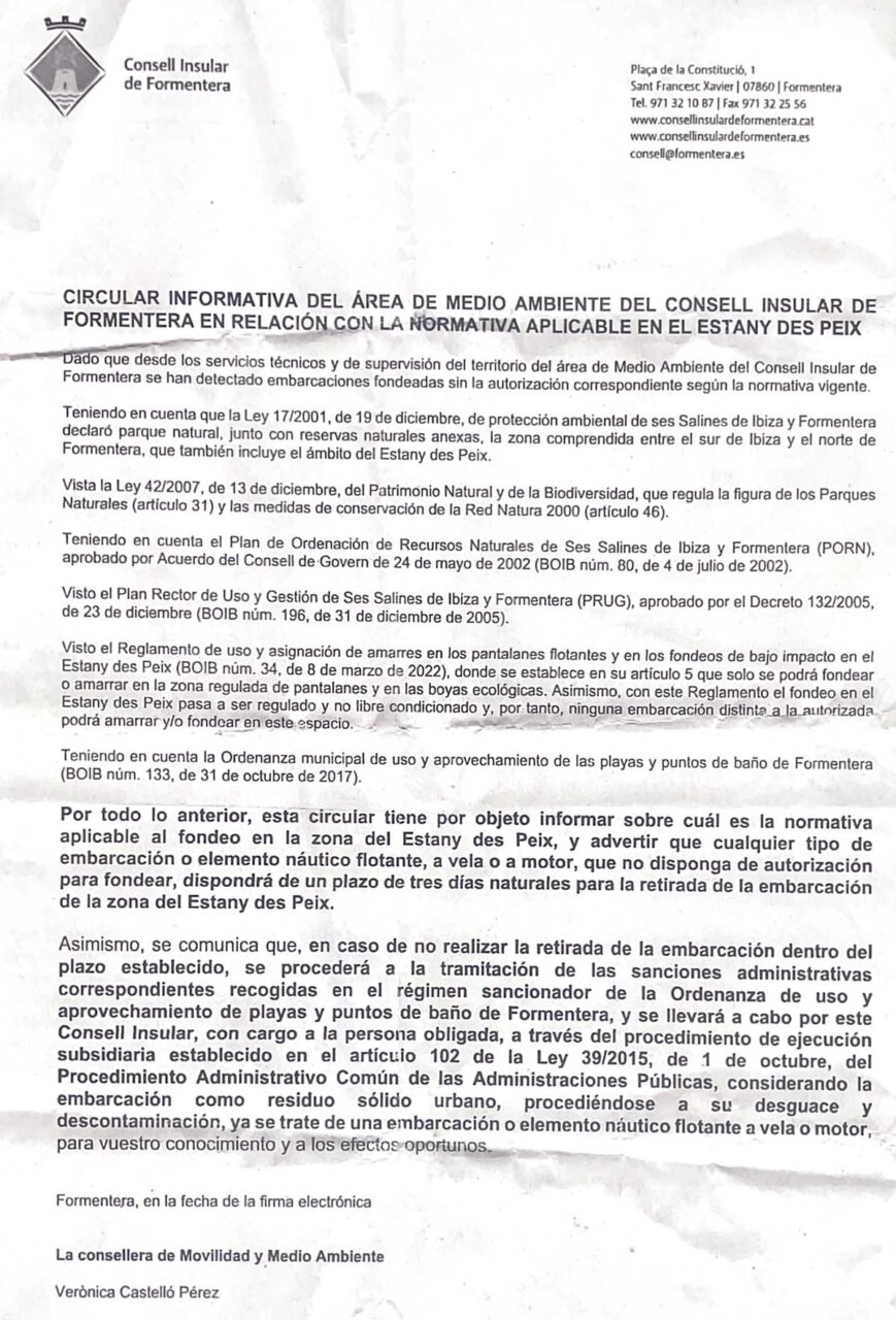 “Esta circular tiene por objeto informar sobre cuál es la normativa aplicable al fondeo en la zona del Estany des Peix y advertir que cualquier tipo de embarcación o elemento náutico flotante, a vela o a motor, que no disponga de autorización para fondear, dispondrá de un plazo de tres días naturales para la retirada de la embarcación de la zona del Estany des Peix”, detalla el escrito que obra en poder de La Voz de Ibiza.