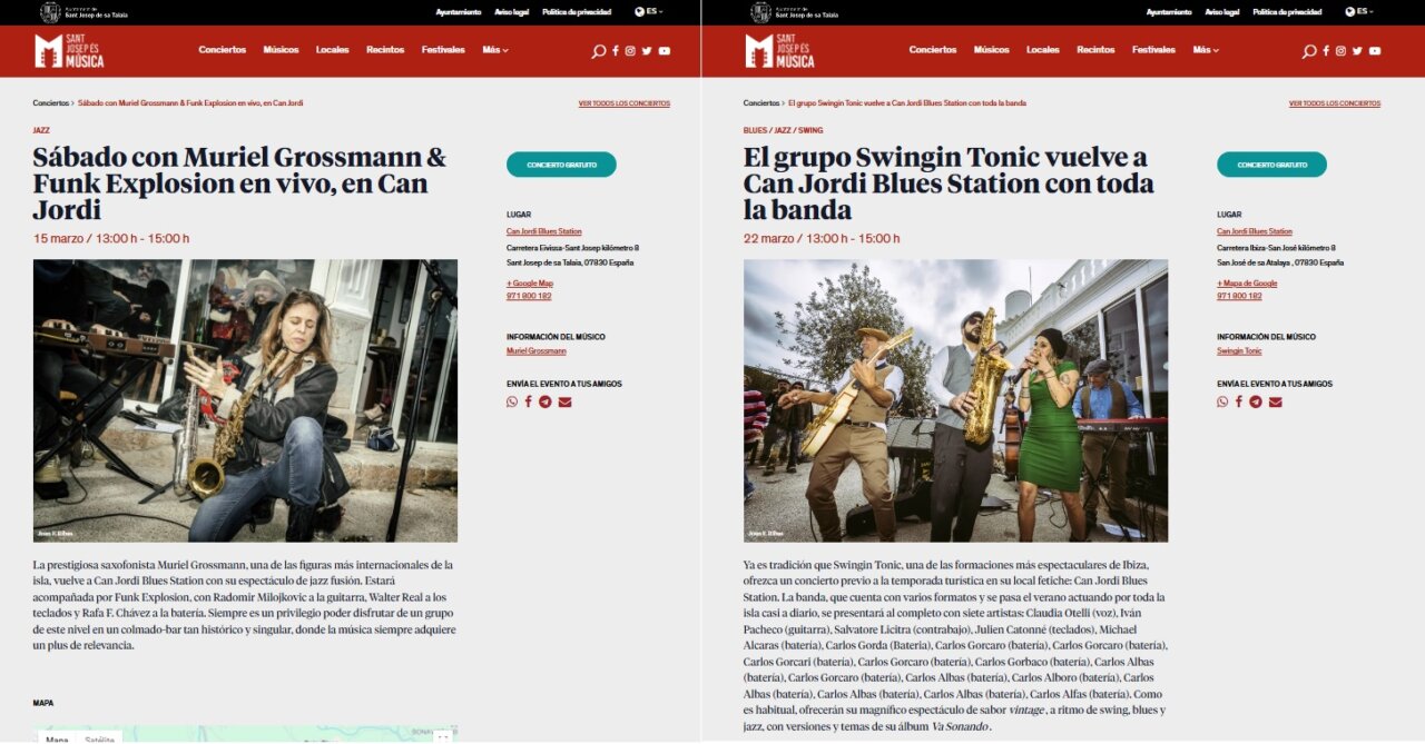 Tanto que el propio Ayuntamiento ha promocionado dos conciertos que se celebrarán en Can Jordi Blues Station: el 15 de marzo se presentará allí “la prestigiosa saxofonista Muriel Grossmann, una de las figuras más internacionales de la isla”; mientras que el 22 de marzo lo hará “Swingin Tonic, una de las formaciones más espectaculares de Ibiza, ofrezca un concierto previo a la temporada turística en su local fetiche”, tal como se anuncia en el sitio Sant Josep És Música.