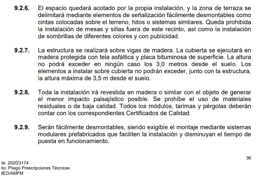 Además de lo establecido en el pliego administrativo, que determina que todas las concesiones administrativas debían “ser desmontadas un mes al año (durante el primer trimestre del año) las temporales al finalizar la temporada”, el pliego técnico no deja lugar a la duda.