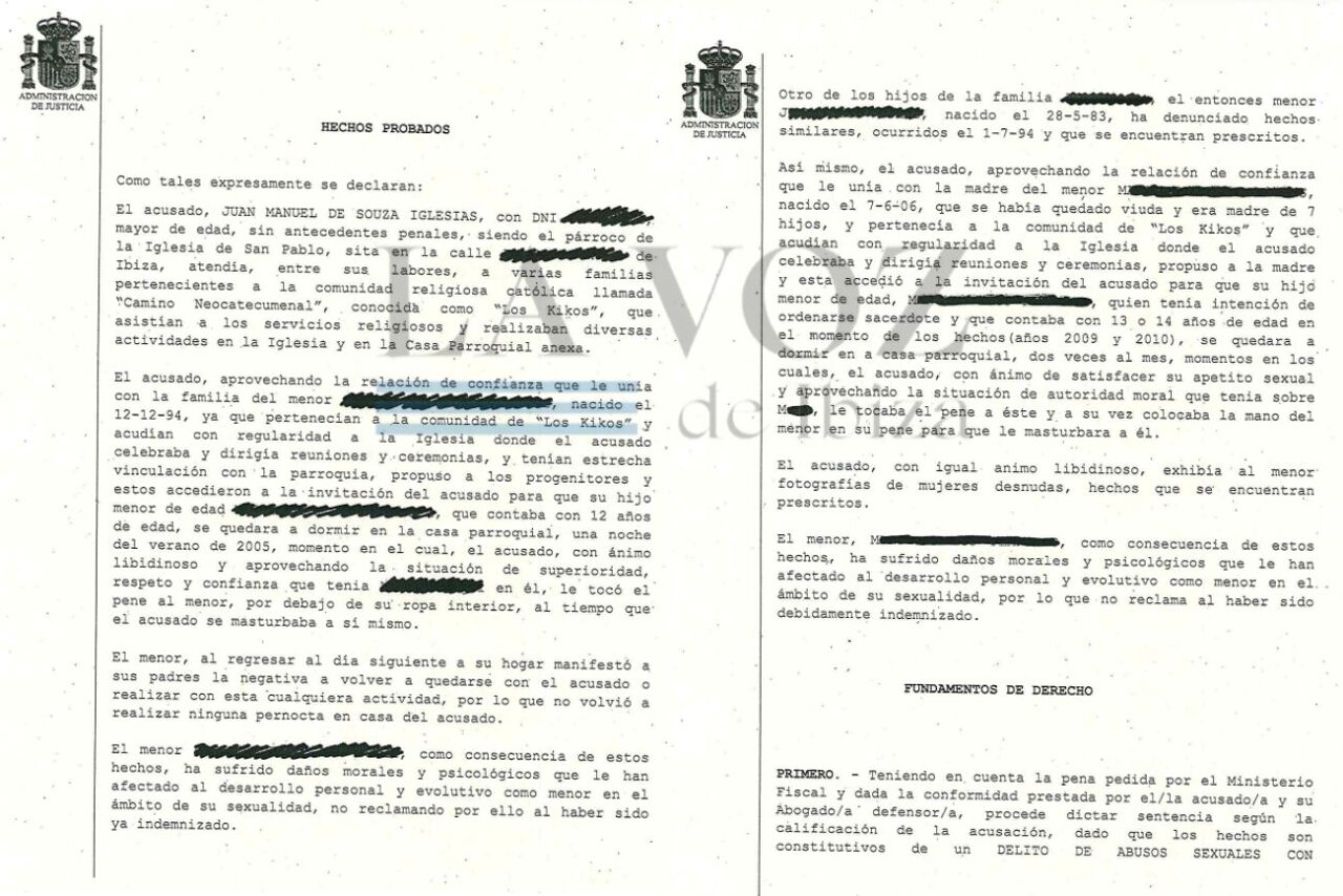 La sentencia firme contra el sacerdote Juan Manuel de Souza Iglesias, dictada por el Juzgado de lo Penal Nº 1 de Ibiza, revela una secuencia de abusos sexuales cometidos contra dos menores de edad en el entorno de la parroquia de San Pablo, donde el acusado ejercía como párroco y referente espiritual de la comunidad religiosa “Camino Neocatecumenal”, conocida como “Los Kikos”.