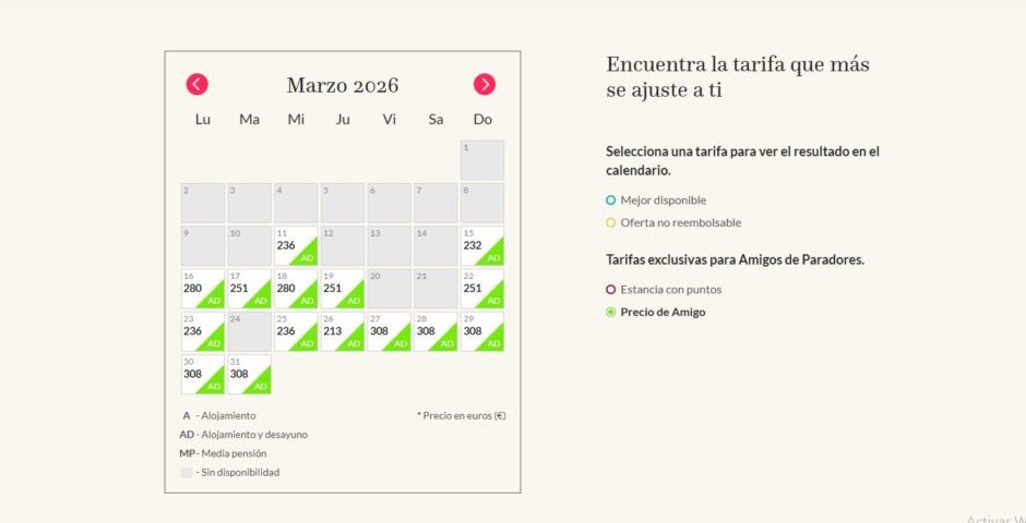 La web, que presenta algunas dificultades, el acceso a las reservas está restringido a los clientes del club de fidelización Amigos de Paradores, cuya inscripción es gratuita. Para el resto de usuarios, la web paradores.es devuelve de forma reiterada el mensaje “El parador seleccionado no tiene habitaciones disponibles para las fechas elegidas”, tanto para marzo como para cualquier fecha posterior.