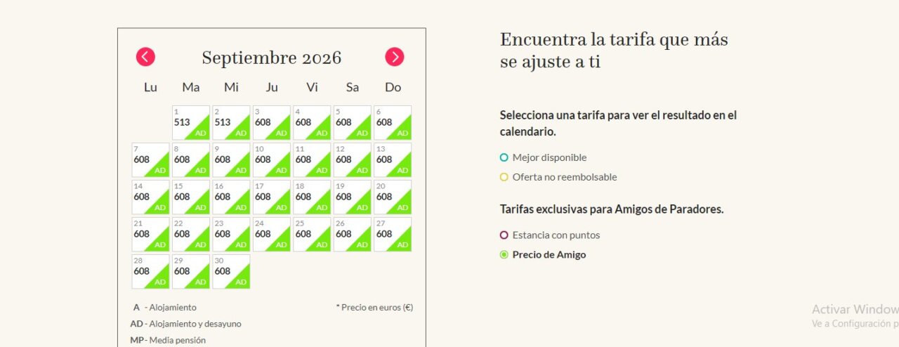 En julio de 2026, los precios alcanzan sus niveles más elevados para el alojamiento y desayuno. Durante los primeros días del mes, el precio por noche se sitúa en 513 euros, mientras que en septiembre, la tarifa generalizada es de 608 euros por noche, según la información visible en la web de Paradores para miembros del club.