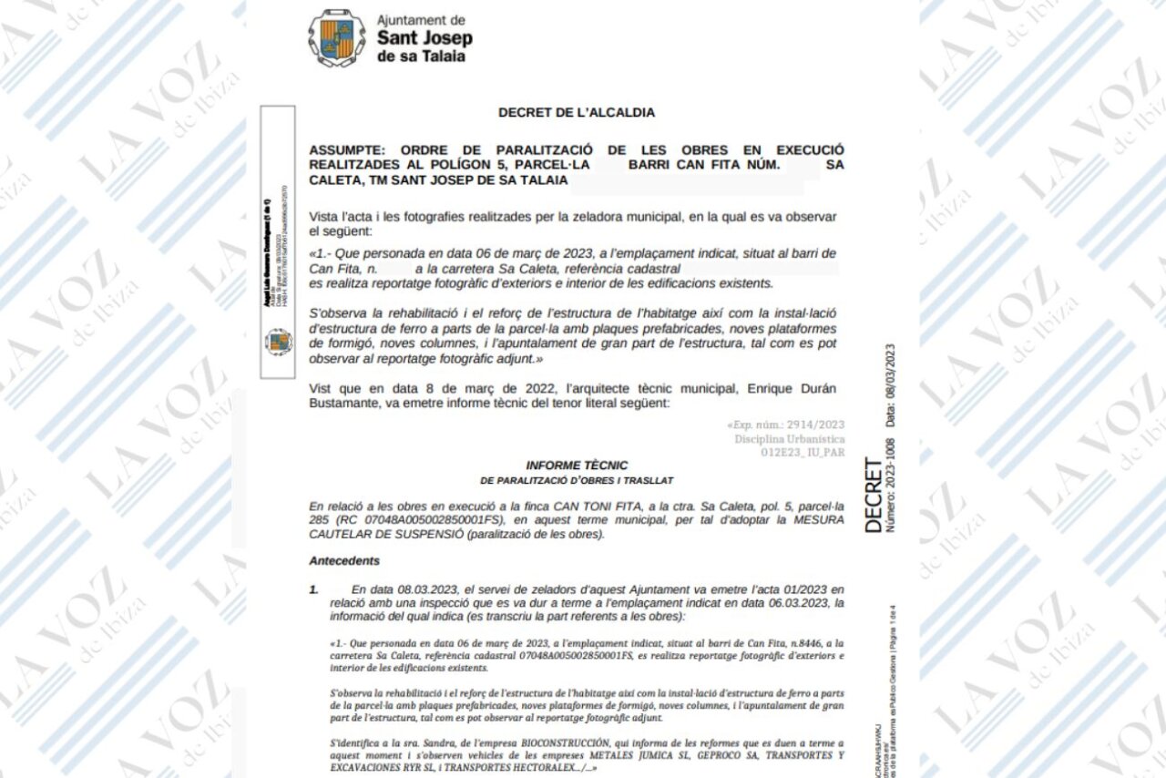 El 8 de marzo de 2023, un decreto de Alcaldía estableció la orden de paralización de las obras en ejecución realizadas en “el polígono 5, parcela 285, barrio Can Fita” en Sa Caleta por no contar con la licencia correspondiente.