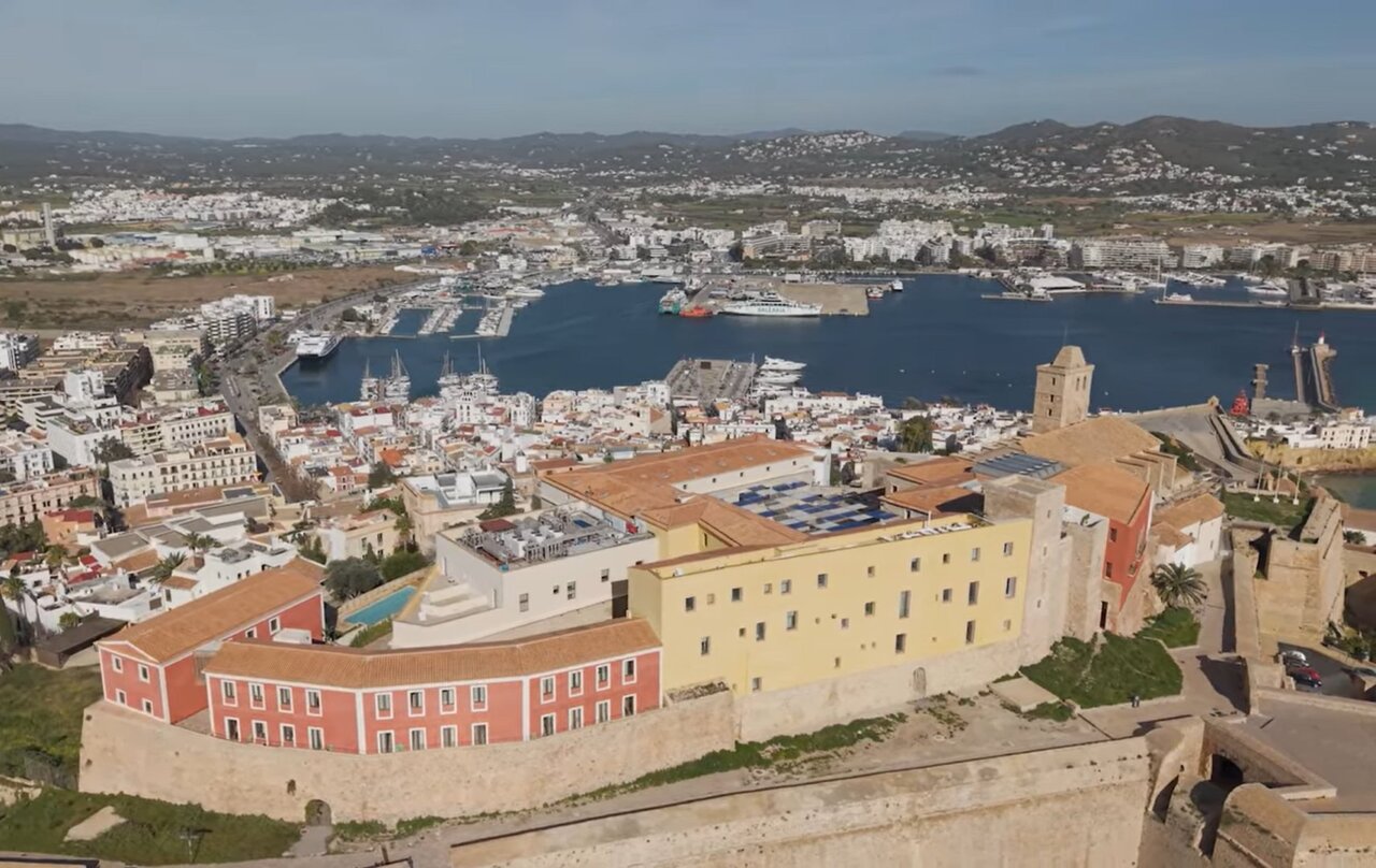 El vídeo pone el acento en la singularidad del enclave, situado en lo más alto de la ciudad y dominando el Mediterráneo, con vistas al puerto de Ibiza y al recinto amurallado.