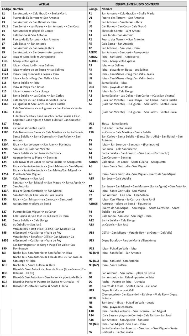 El nuevo sistema contará con 65 líneas integradas en el Plan de líneas insular y el Plan de Movilidad Urbana de Ibiza, organizadas según su función. Las rutas troncales (T) conectarán los principales núcleos urbanos; las de accesibilidad (A) enlazarán poblaciones menores; las rutas P unirán zonas residenciales con playas; las líneas urbanas (U y UE) operarán dentro de los municipios; mientras que las nocturnas (N) y las destinadas al ocio (D) cubrirán franjas específicas.