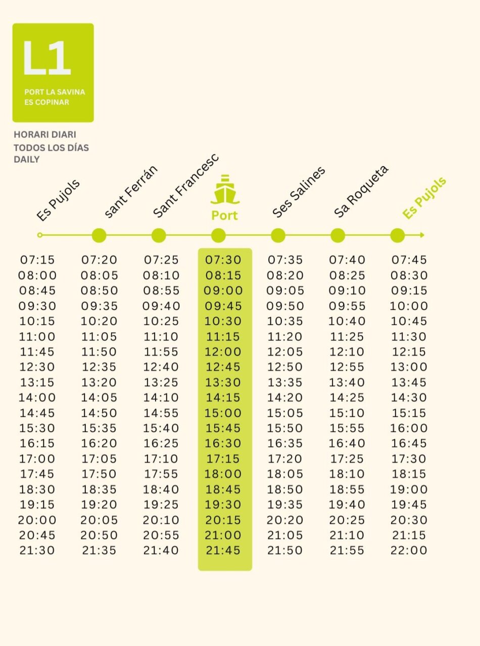 La línea 1 realizará el recorrido circular entre es Pujols, Sant Ferran, Sant Francesc, el puerto de la Savina, ses Salines, sa Roqueta y nuevamente es Pujols, dando la vuelta en sentido horario al lago Pudent. El descanso del servicio se realizará en es Pujols.