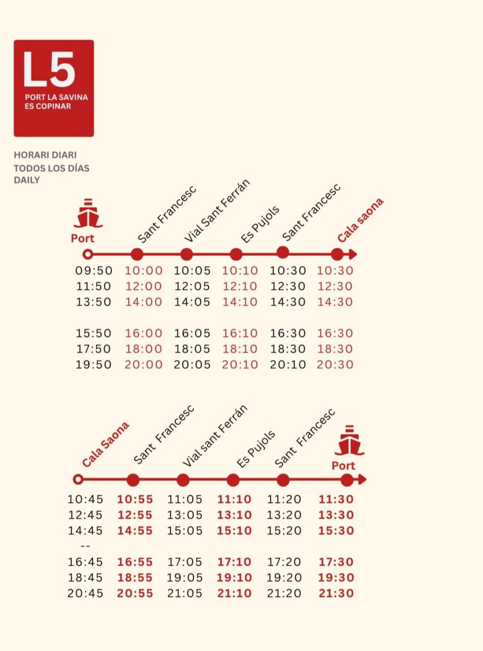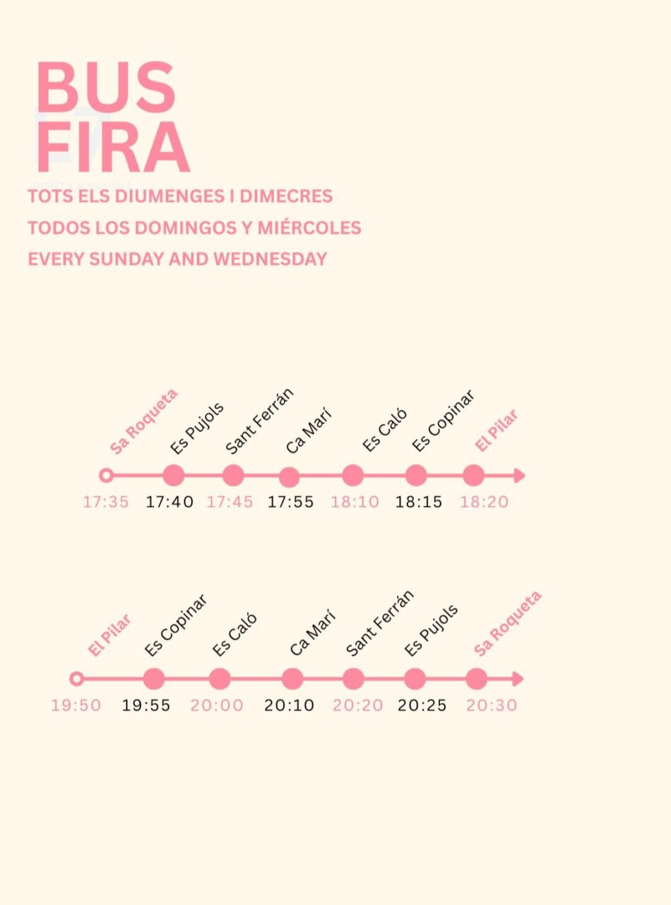 Además, se mantiene el servicio especial del bus de la Fira los miércoles y domingos, reforzando las conexiones de las líneas 2 y 7 entre sa Roqueta, es Pujols, Sant Ferran, Ca Marí, es Caló, es Copinar y el Pilar de la Mola.
