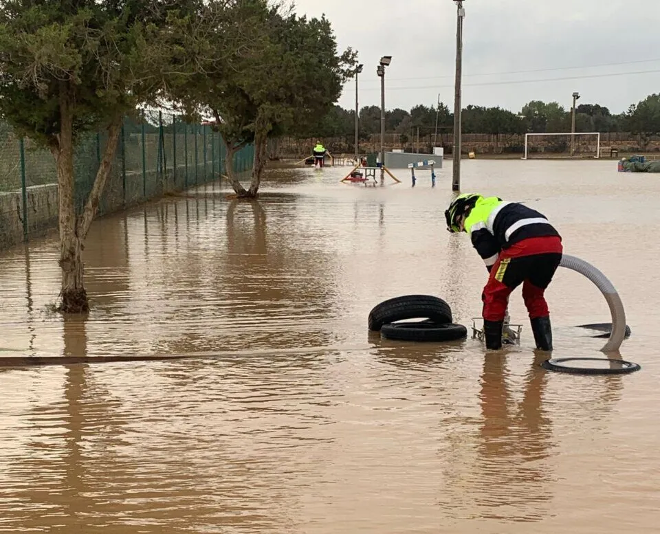 Actualmente, las pistas de atletismo siguen inundadas, y los Bomberos de Formentera trabajan para extraer el agua acumulada. El cuerpo ha reforzado su plantilla con nueve efectivos desde las 13.00 horas: un sargento, dos cabos y seis bomberos.