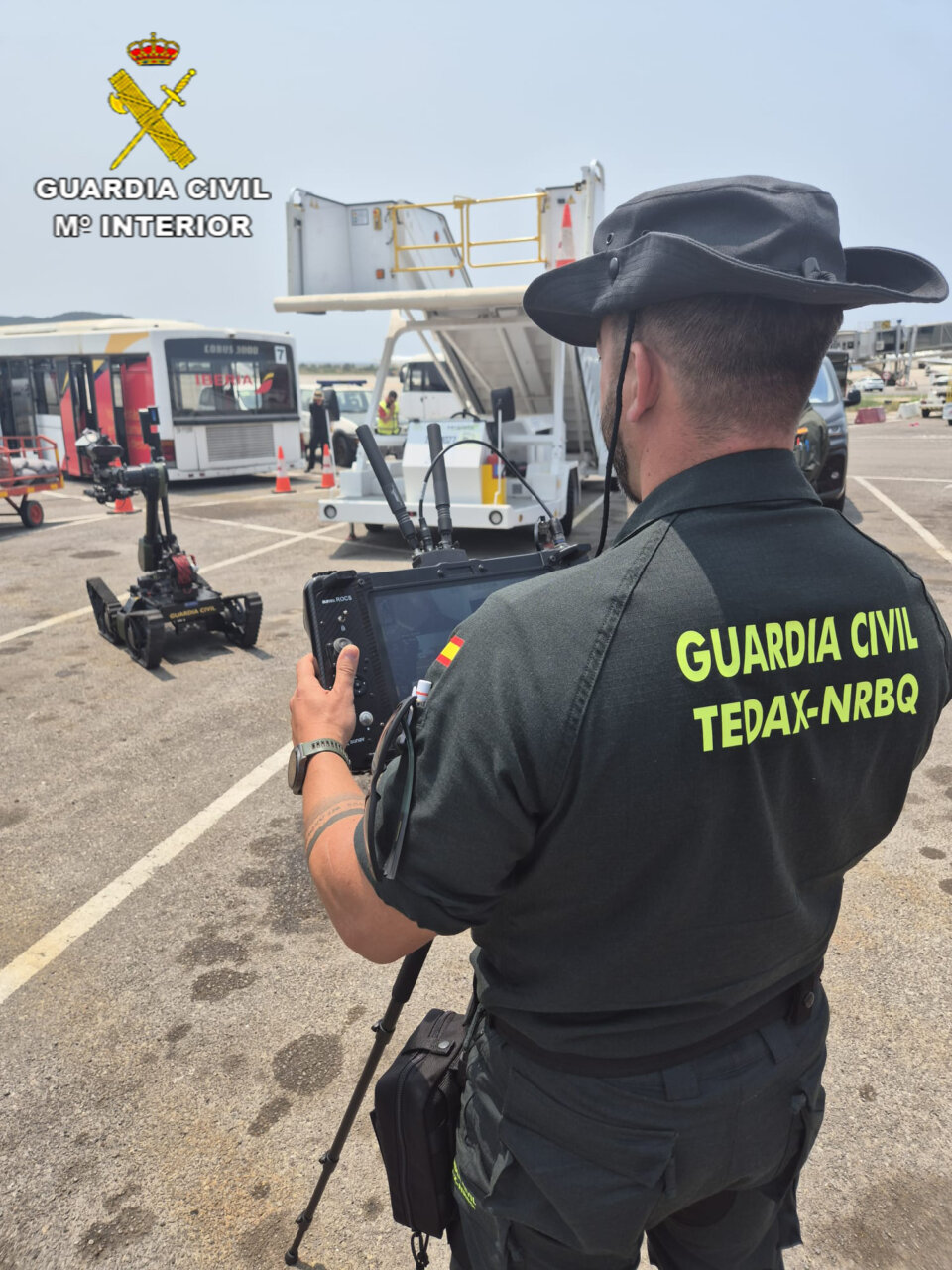 Uno de los ejercicios se desarrolló en la zona de embarque del aeropuerto de Ibiza, donde se simuló la entrada a un autobús y la desactivación de un artefacto explosivo.