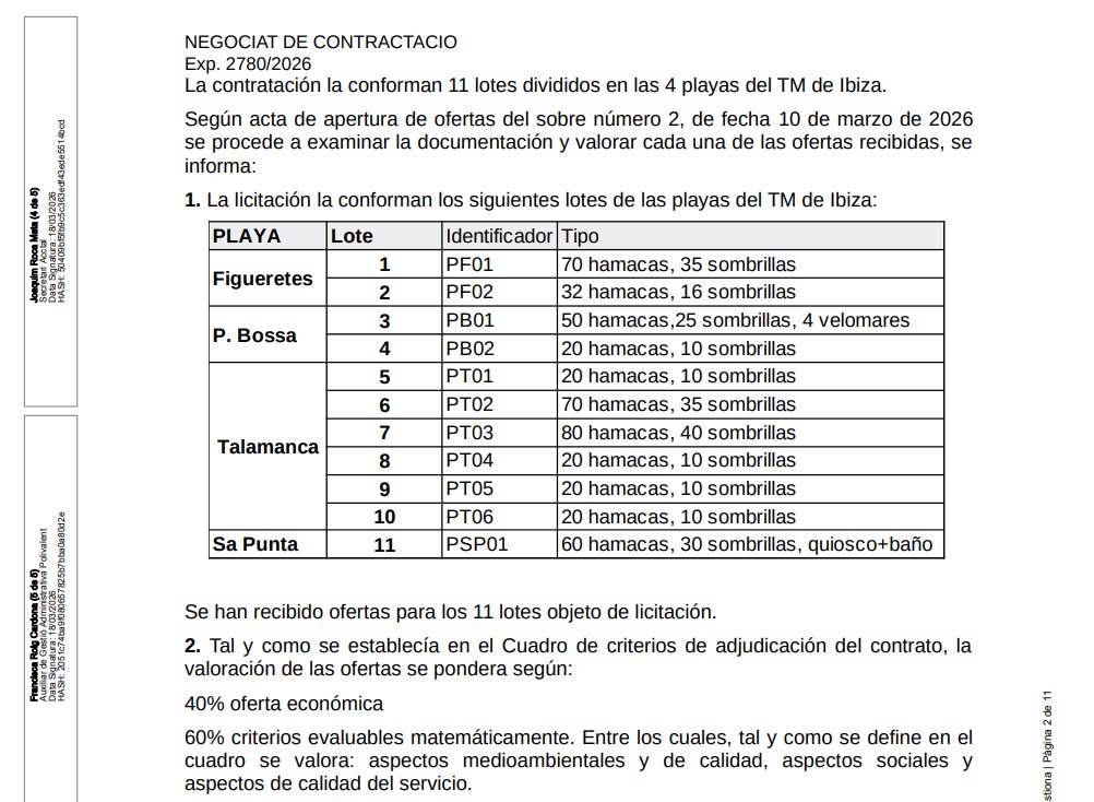 Según recoge el acta de la Mesa de Contratación, el procedimiento se estructura en 11 lotes distribuidos en playas como Figueretes, Talamanca, Playa d’en Bossa y Sa Punta, para la adjudicación de servicios de temporada en dominio público marítimo-terrestre.