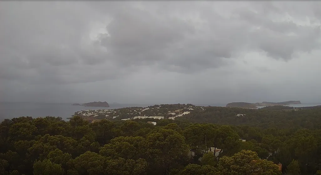 Vista de Ibiza con nubes oscuras y lluvia inminente.