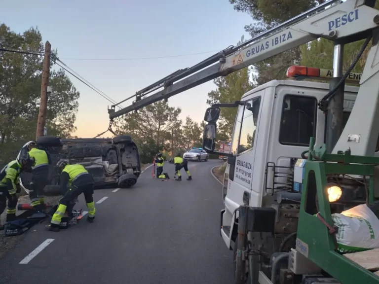 Un vehículo turismo ha volcado por causas que se desconocen esta tarde en el Camí Vell de Portinatx. Sus dos ocupantes han tenido que ser excarcelados por la dotación de Bomberos de Ibiza desplaza al lugar de los hechos. Posteriormente, han sido evacuados en sendas ambulancias. También han acudido al lugar del accidente la Guardia Civil y un equipo de Grúas Ibiza.