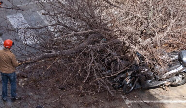 Uno de los sucesos registrados durante la mañana ha sido la caída de un pino en el Carrer de Canarias, que ha acabado desplomándose sobre varias motos estacionadas en la zona. La Policía Local ha obligado a cortar la vía mientras se llevan a cabo los trabajos de retirada del árbol con motosierra para garantizar la seguridad.