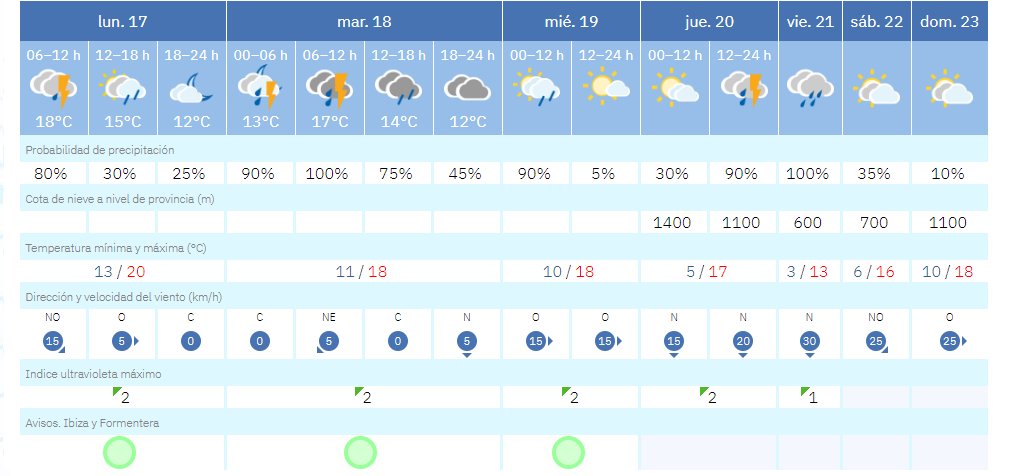 La semana arranca en Ibiza bajo un episodio de inestabilidad atmosférica que afectará a toda la zona de avisos de Ibiza y Formentera. Las previsiones meteorológicas para los próximos días apuntan a un aumento generalizado de la probabilidad de lluvia, un descenso progresivo de las temperaturas y episodios de viento moderado.