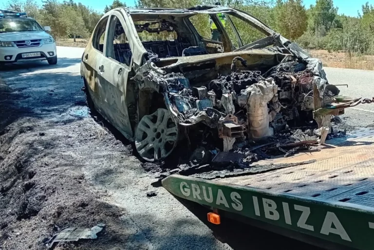Los Bomberos de Ibiza han sofocado esta mañana el incendio de un automóvil que ha quedado completamente calcinado. Las causas del incendio son desconocidas, aunque las llamas llegaron hasta la vegetación.