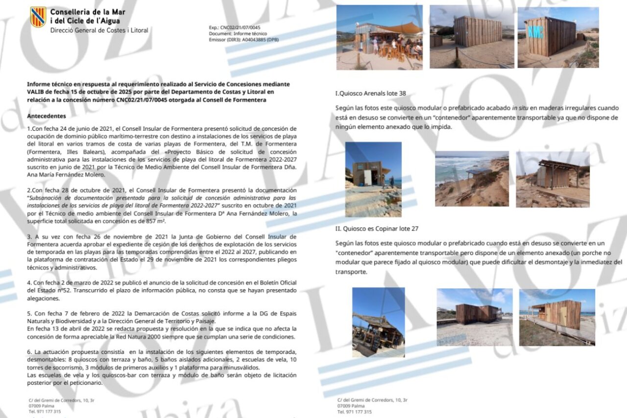 El informe también cuestiona la actitud del Consell de Formentera. Según detalla, “en el acta de reconocimiento de junio de 2025 se indica al Consell de Formentera que debe acreditar que los quioscos son fácilmente desmontable”.