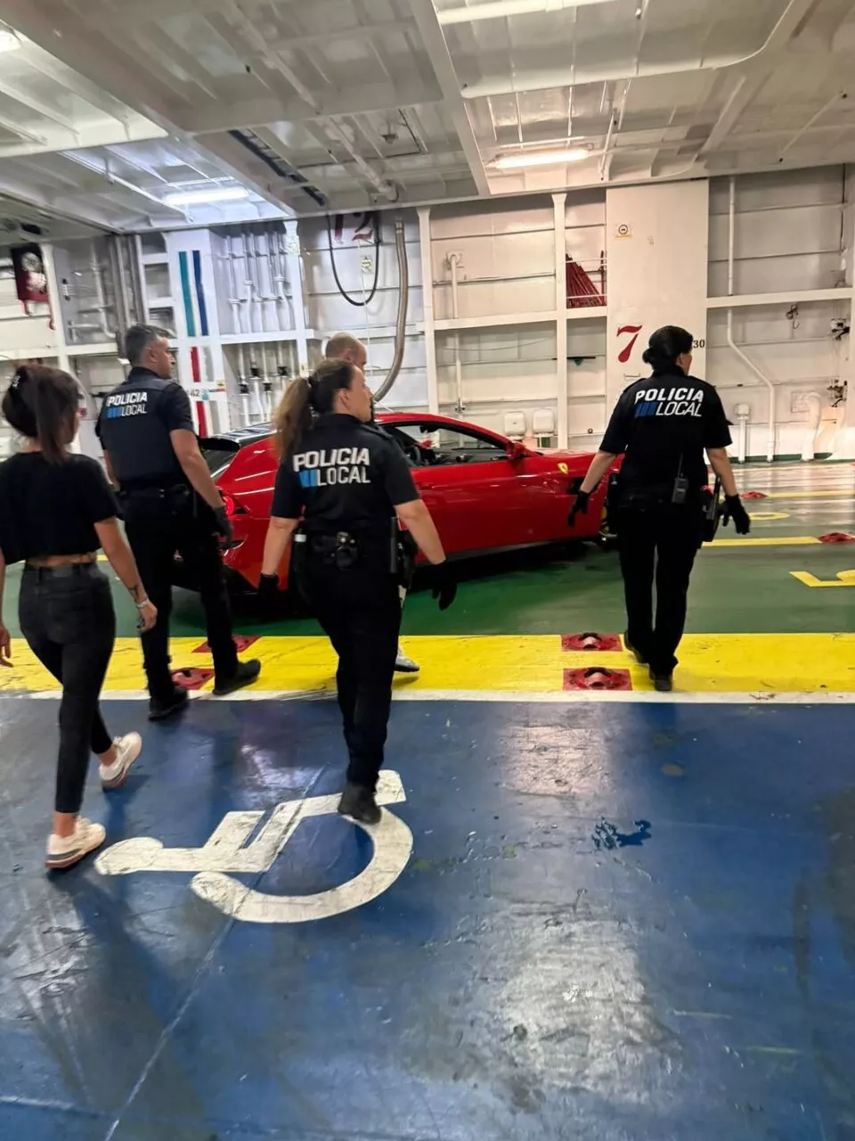 Al llegar a puerto, los agentes tuvieron que acceder a la bodega del ferry, donde uno de los implicados permanecía alterado y bloqueaba la salida de vehículos y pasajeros. Tras identificarlo, se comprobó que presentaba claros síntomas de embriaguez. Su coche, un Ferrari, se encontraba en el interior del buque, por lo que fue retirado para permitir el desembarco y posteriormente trasladado al depósito municipal.