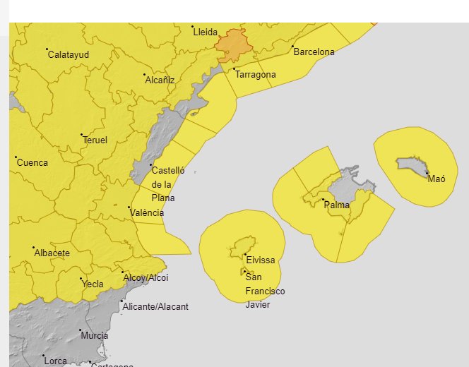 En Ibiza y Formentera, el aviso será amarillo por viento y fenómenos costeros, con mar combinada de 3 a 4 metros y viento del oeste que podría superar los 60 km/h. En Mallorca y Menorca, los avisos serán de nivel naranja por oleaje, con olas que podrían alcanzar los 5 metros en el norte de las islas y fuerte tramontana en Menorca.
