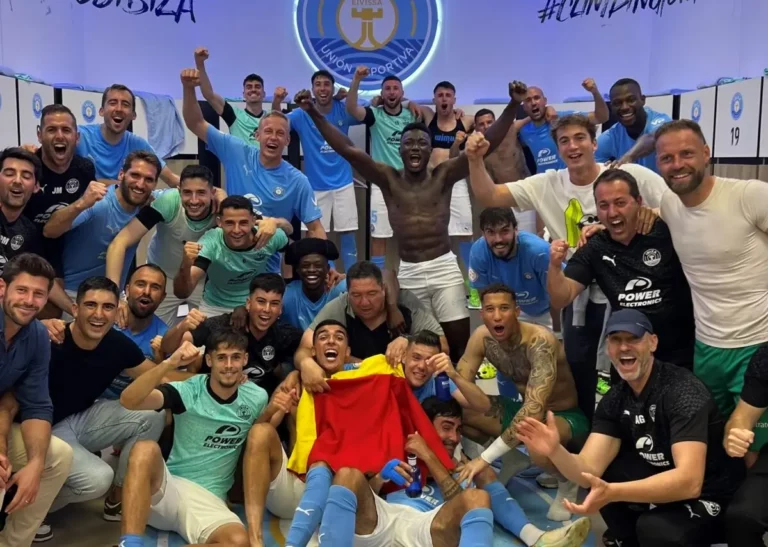 La UD Ibiza celebrando la victoria.