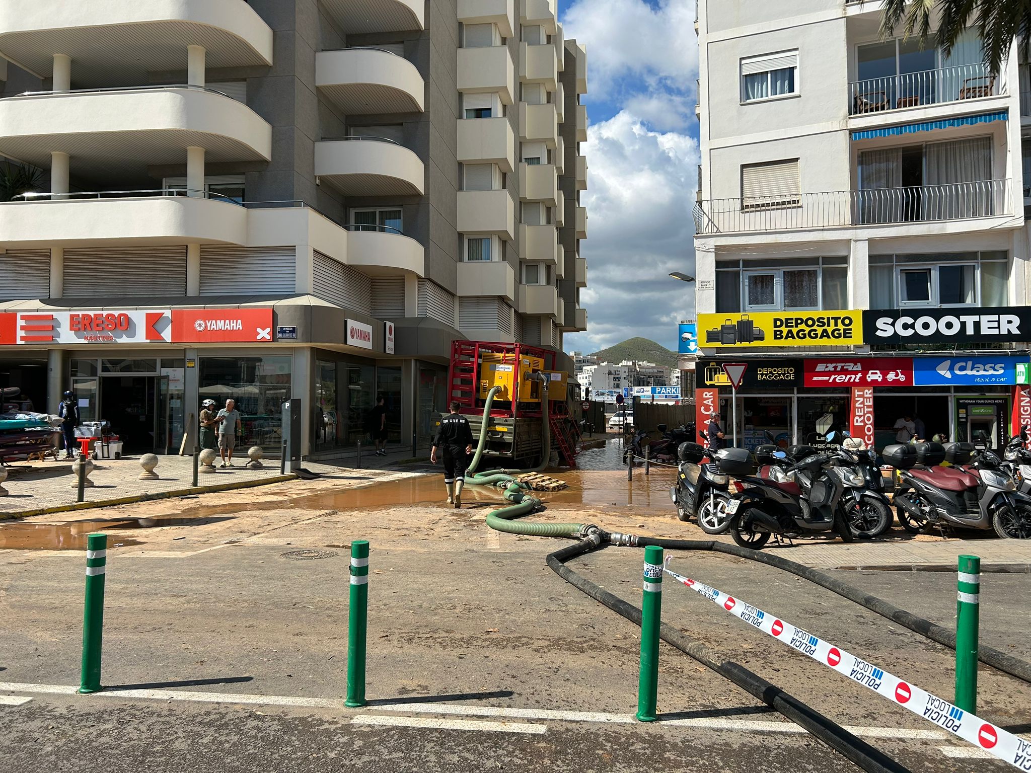 Las labores se concentran en la avenida 8 de Agosto, frente a la estación marítima de Formentera, donde el tanque de tormenta quedó saturado y esta mañana se procedía a su vaciado.