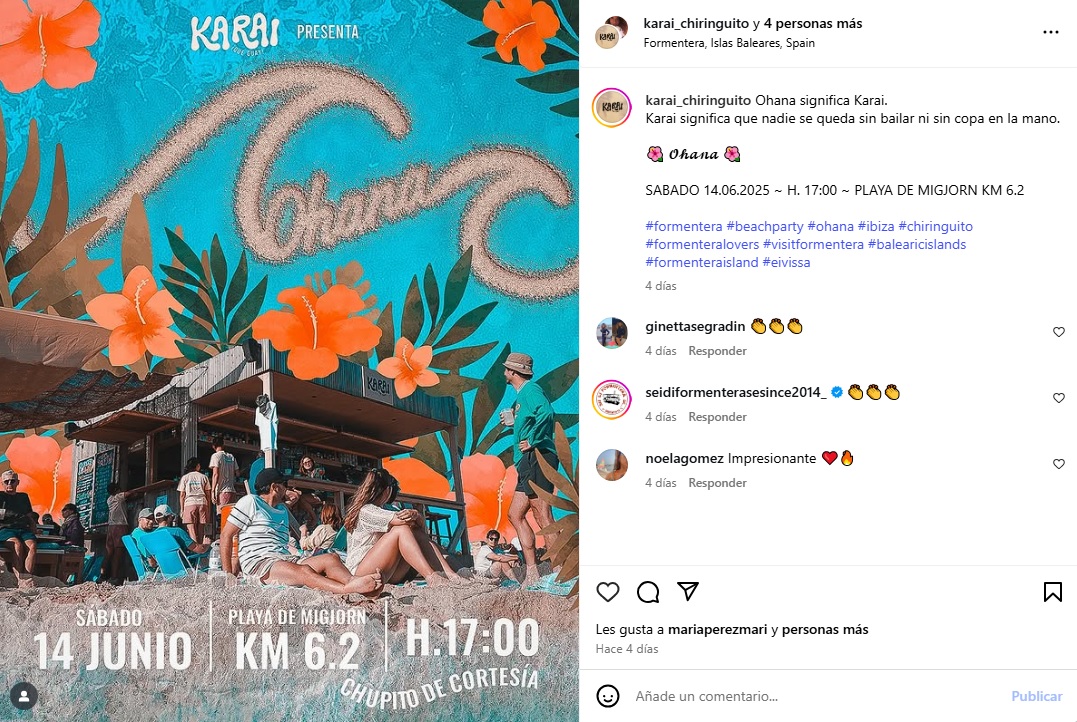 “Ohana significa Karai. Karai significa que nadie se queda sin bailar ni sin copa en la mano”, han anunciado a través de las redes sociales para el próximo sábado 14 de junio a partir de las 17 horas, en el kilómetro 6.2 de playa de Migjorn.