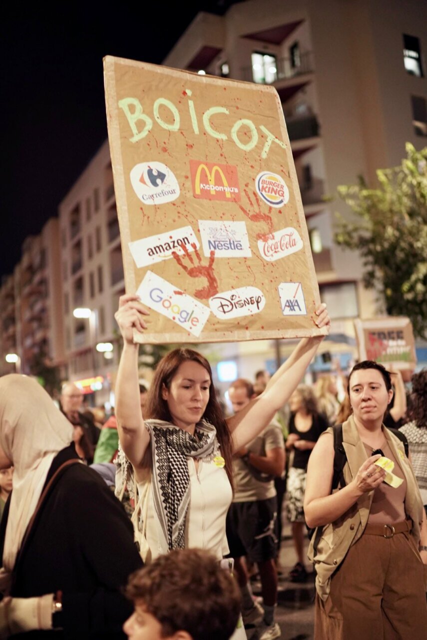 Persona sosteniendo un cartel de boicot en una manifestación nocturna.