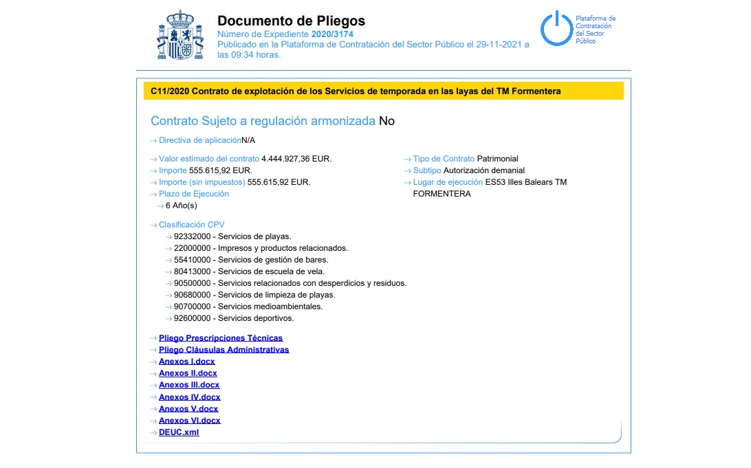 Según los datos públicos del portal de Contratación, la licitación de los 50 lotes contemplaban la Clasificación CPV (Common Procurement Vocabulary) de “Servicios de gestión de bares; Impresos y productos relacionados; Servicios de escuela de vela; Servicios de playas y Servicios deportivos”.