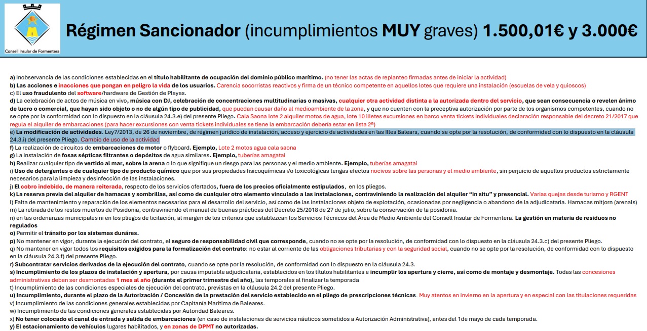 Entre las obligaciones de los adjudicatarios, establecidos en los pliegos técnicos y administrativos, se encuentra prohibida la “utilización de elementos no propios del objeto de la actividad autorizada” y la “modificación de la actividad autorizada en los términos que regula la Ley 7/2013 de 26 de noviembre, de régimen jurídico de instalación, acceso y ejercicio de actividades en las Islas Baleares”.
