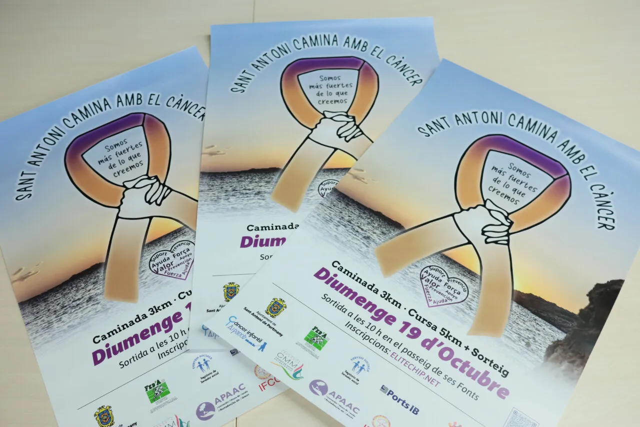 El Ayuntamiento de Sant Antoni de Portmany ha presentado la segunda edición de la marcha solidaria ‘Sant Antoni Camina amb el Càncer’, que se celebrará el domingo 19 de octubre a partir de las 10.00 horas en el Passeig de ses Fonts. La cita propone dos modalidades abiertas a todas las edades: una caminata de tres kilómetros y una carrera de cinco kilómetros cuyo objetivo es recaudar fondos para asociaciones contra el cáncer de Ibiza y Formentera.