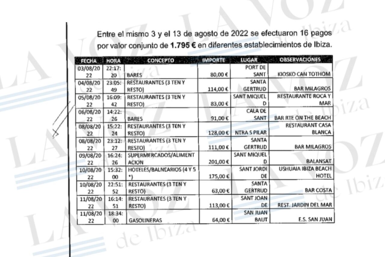 Según detalla el informe de la Guardia Civil, entre el 3 y el 13 de agosto de 2022, se efectuaron 16 pagos por valor conjunto de 1.795 euros en diferentes establecimientos de Ibiza. El detalle incluye hasta la hora en que se produjo el pago.