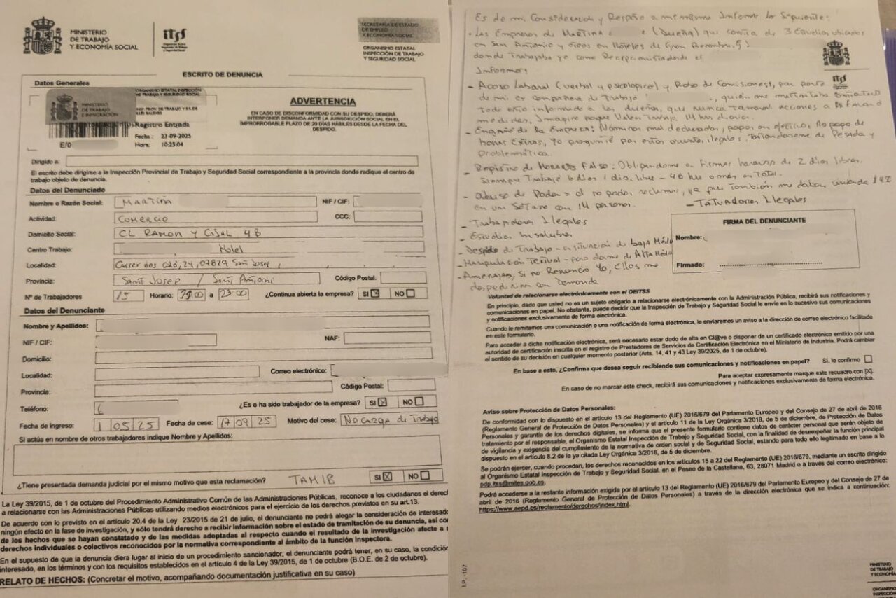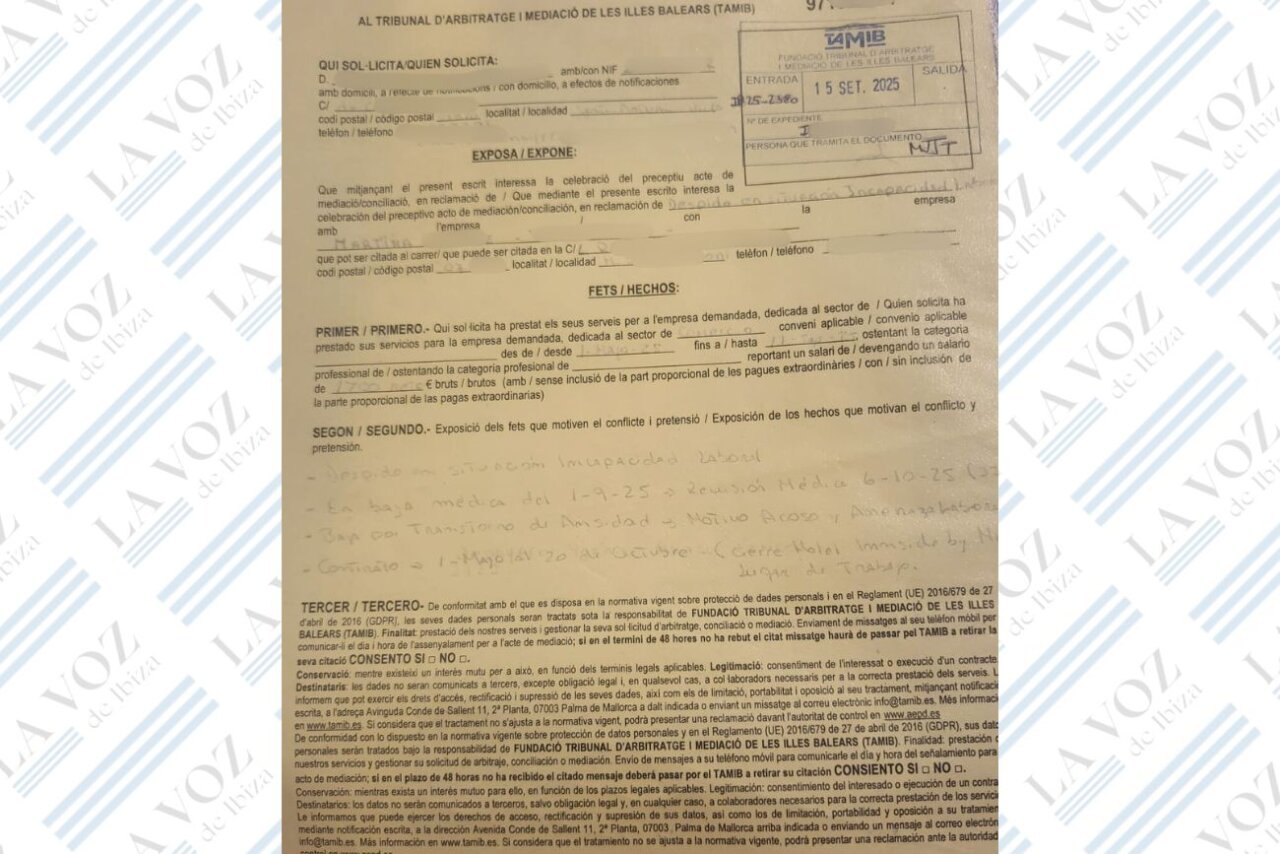 En tanto, también ha radicado una reclamación ante el Tribunal de Arbitraje y Mediación de las Islas Baleares (TAMIB) por su despido “en situación de incapacidad laboral” ya que se encontraba en baja médica desde el 1 de septiembre por “trastorno de ansiedad” producto de las “amenazas y acoso laboral” que dice sufrir.