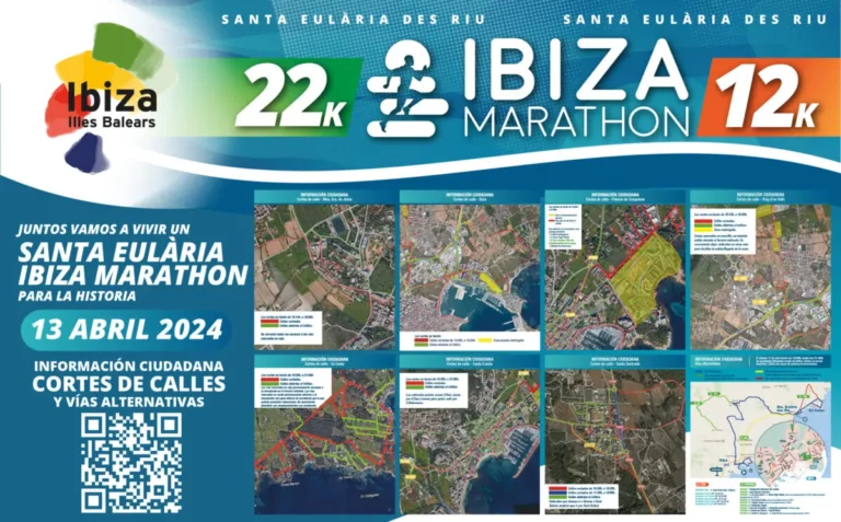 Por otra parte, por la prueba deportiva Santa Eulària Ibiza Marathon que se llevará a cabo el próximo sábado día 13 de abril de 2024, con salida de los andenes del puerto de Ibiza a las 15.30 h, se prohíbe la circulación de vehículos por las siguientes vías, al paso de los corredores, entre las 15 y las 17.