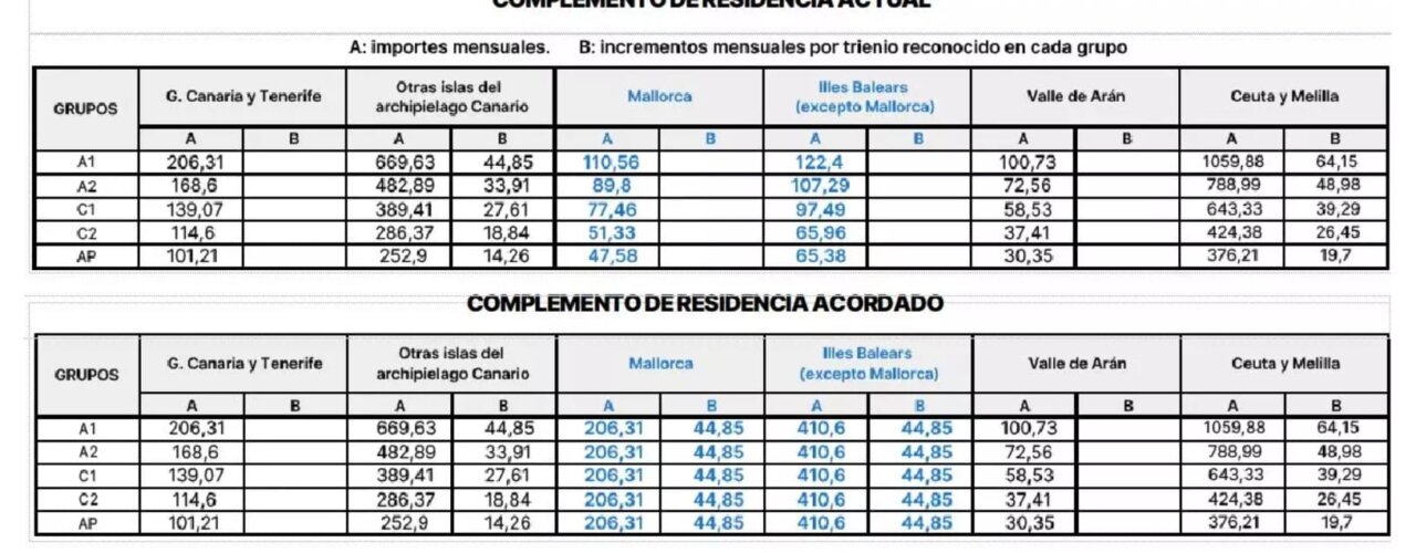 Actualmente, los funcionarios estatales perciben cantidades sensiblemente inferiores: entre 110,56 y 47,58 euros en Mallorca y entre 122,4 y 65,38 euros en el resto del archipiélago.