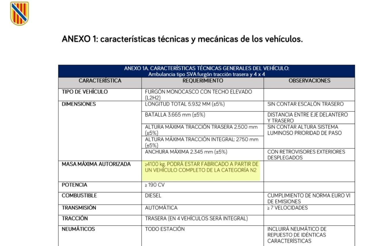 Solo las ambulancias tipo A2 con camilla y la unidad tipo farmacia móvil se establecía en los pliegos que debían tener un peso “no superior a 3.500 kilogramos”.