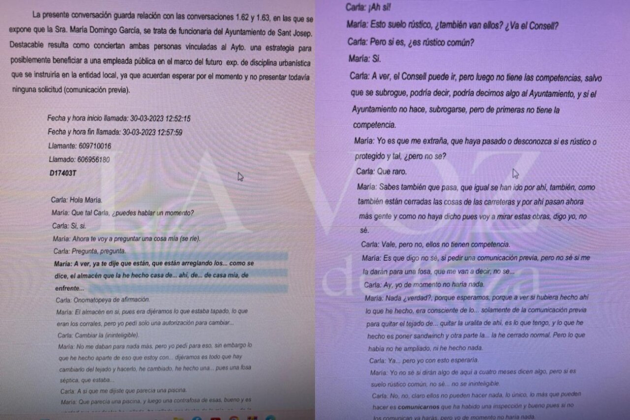 Las conversaciones telefónica interceptadas por la Guardia Civil entre la abogada de Urbanismo del Ayuntamiento de Sant Josep, Carla García Martínez, y la secretaria municipal del mismo ayuntamiento, María Domingo, no solo fueron determinantes para ampliar la investigación en el marco de la macro causa Magister dixit contra la promotora de obras «ilegales e ilegalizables» en una finca en suelo rústico en su propio municipio sino también para establecer claros indicios de la posible comisión de un delito contra la ordenación del territorio.