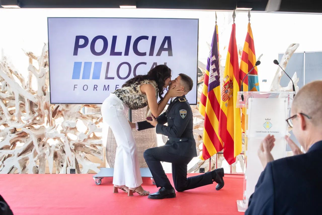 La tradicional Diada de la Policía Local de Formentera, celebrada este sábado en el hotel Cala Saona, dejó una imagen para el recuerdo. En medio del acto institucional de reconocimiento a los agentes del cuerpo, uno de ellos sorprendió a su pareja con una pedida de matrimonio que provocó los aplausos y las sonrisas de todos los asistentes.