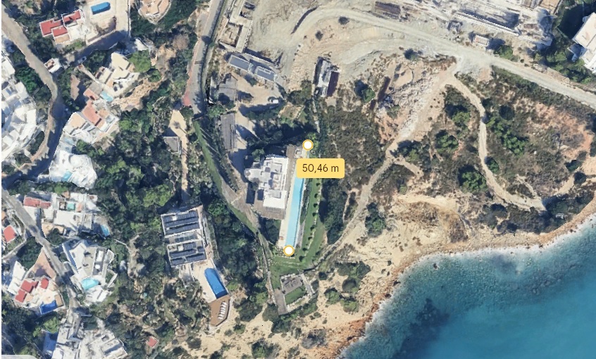 Se trata de una piscina de longitud casi olímpica de casi 50 metros de largo, tal como se puede comprobar a través de las mediciones de Google Earth.