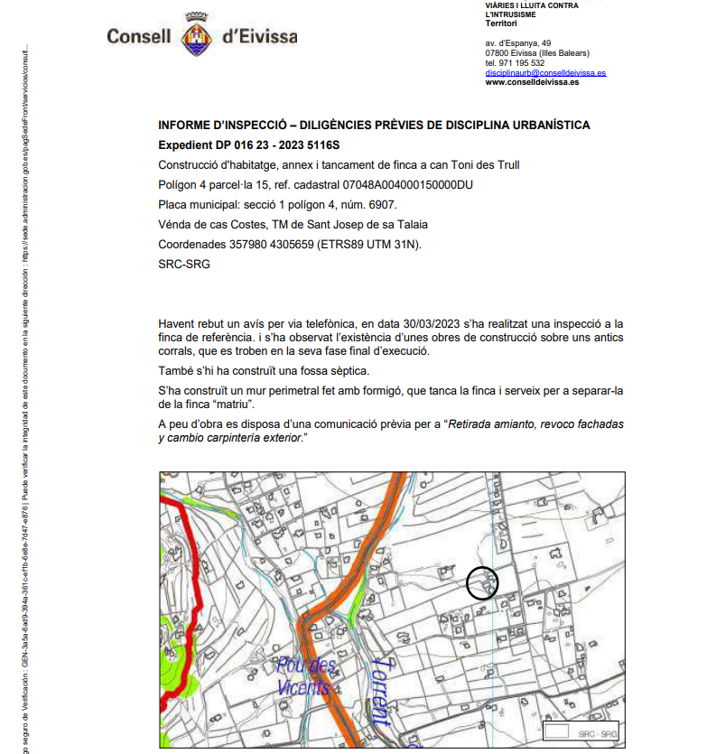 De todas formas, el Consell no ha podido llevar adelante actuaciones disciplinarias al no tener competencias sobre el área, al ser rústico común, salvo en lo relativo a Patrimonio debido a la antigüedad de la vivienda principal. Por lo que traslada el informe al Ayuntamiento de Sant Josep.