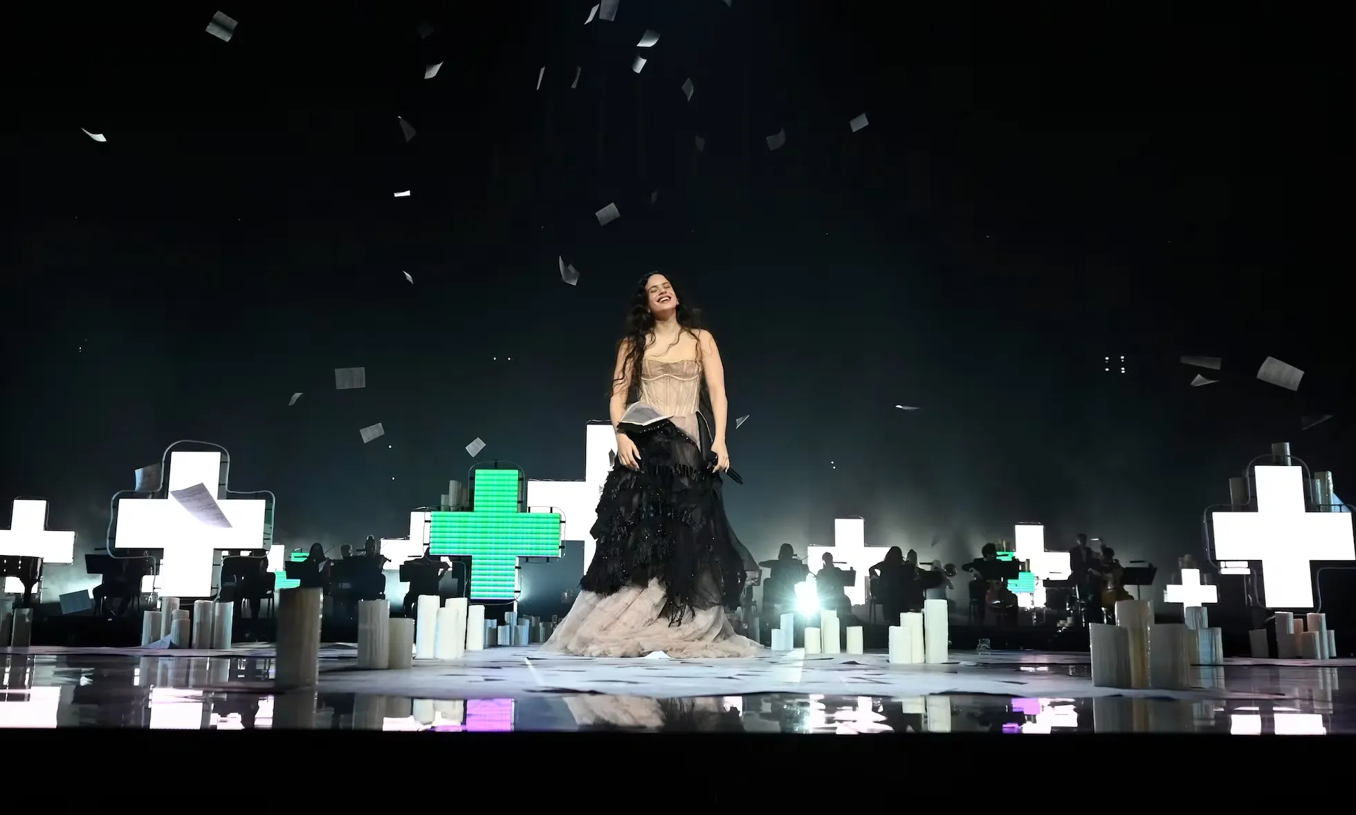 Las luces del recinto permanecían apagadas cuando comenzaron a sonar los primeros acordes de cuerda, interpretados por una orquesta en directo. Sin previo aviso, el escenario se iluminó con cruces encendidas que proyectaban fragmentos de la letra de la canción. Fue entonces cuando Rosalía apareció, envuelta en un halo de luz que la mantenía como único foco visual sobre el escenario. A su alrededor, un ambiente casi místico acompañaba cada nota de la interpretación.