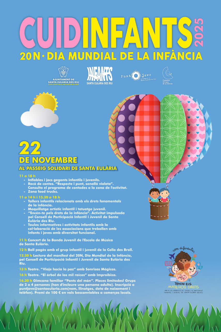 The City Council of Santa Eulària, through the Department of Children and Youth, organizes the sixth edition of Cuidinfants, an event designed for children aged 3 to 11 years. The celebration will take place on Saturday, November 22, from 11.00 to 18.00 hours, in the Passeig Solidari.