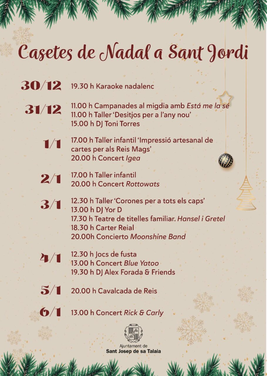 The Christmas booths of Sant Jordi face the final stretch of the holidays with a varied program that will last until January 6. Live music, children’s workshops and traditional events will once again fill the town center, with two important dates on the calendar: December 31, with the midday chimes, and January 5, with the arrival of the Three Wise Men.
